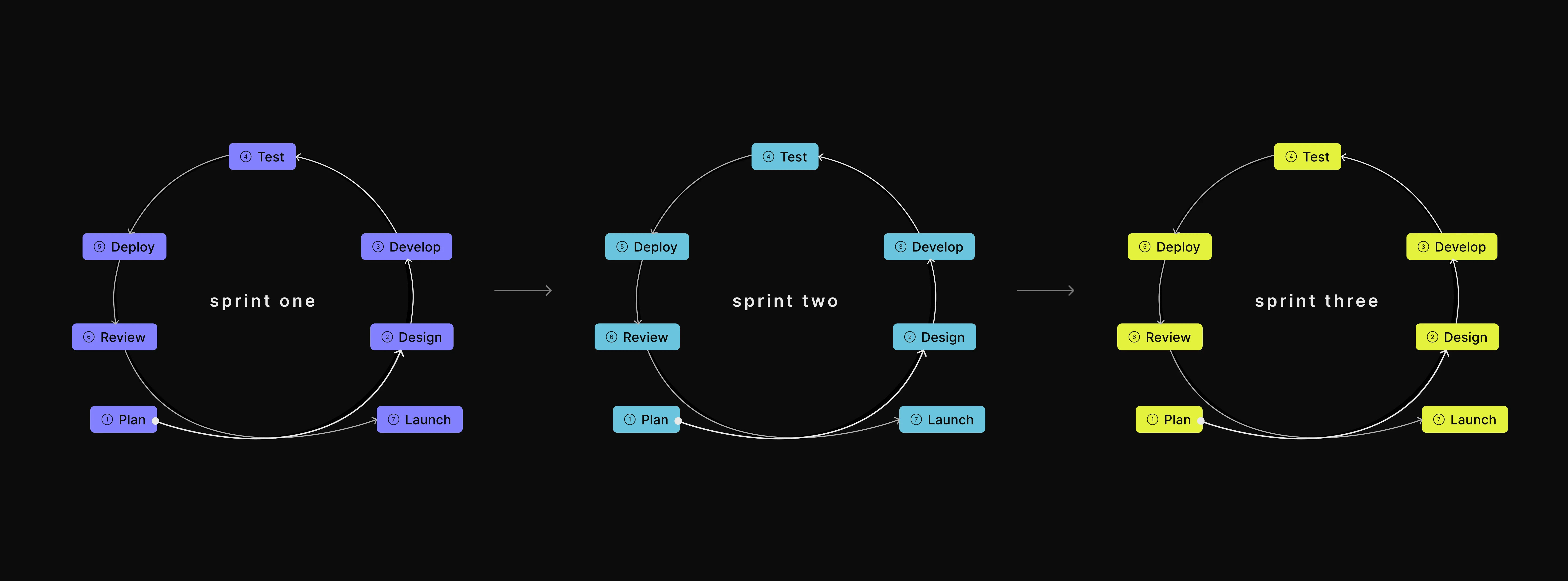 Die folgende Grafik zeigt, wie die Sprints in einem Scrum Projekt direkt ineinander übergehen: Auf eine Planungsphase folgt die Umsetzung, wie sie in IT-Projekten üblich ist in den Schritten Design, Entwicklung, Testen, Deployen, Review und Launch. Solange sich noch Themen im Produkt Backlog befinden, folgt darauf stets ein weiterer Sprint, bis das Produkt fertiggestellt ist.